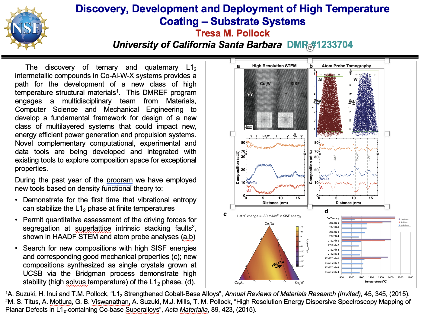 •Search for new compositions with high SISF energies and corresponding good mechanical properties (c); new compositions synthesized as single crystals grown at UCSB via the Bridgman process demonstrate high stability (high solvus temperature) of the L12 phase, (d).