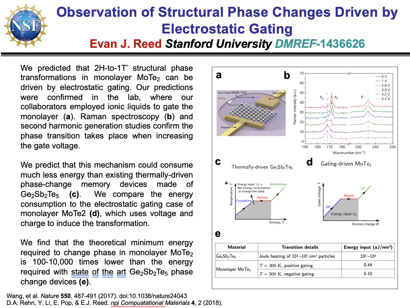 We predicted that 2H-to-1T’ structural phase transformations in monolayer MoTe2 can be driven by electrostatic gating. Our predictions were confirmed in the lab, where our collaborators employed ionic liquids to gate the monolayer (a). Raman spectroscopy (b) and second harmonic generation studies confirm the phase transition takes place when increasing the gate voltage.
