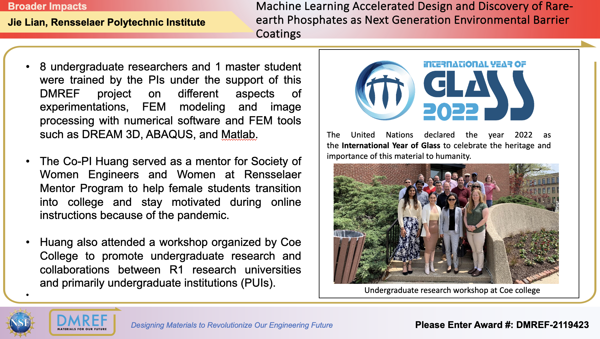 8 undergraduate researchers and 1 master student were trained by the PIs under the support of this DMREF project on different aspects of experimentations, FEM modeling and image processing with numerical software and FEM tools such as DREAM 3D, ABAQUS, and Matlab.