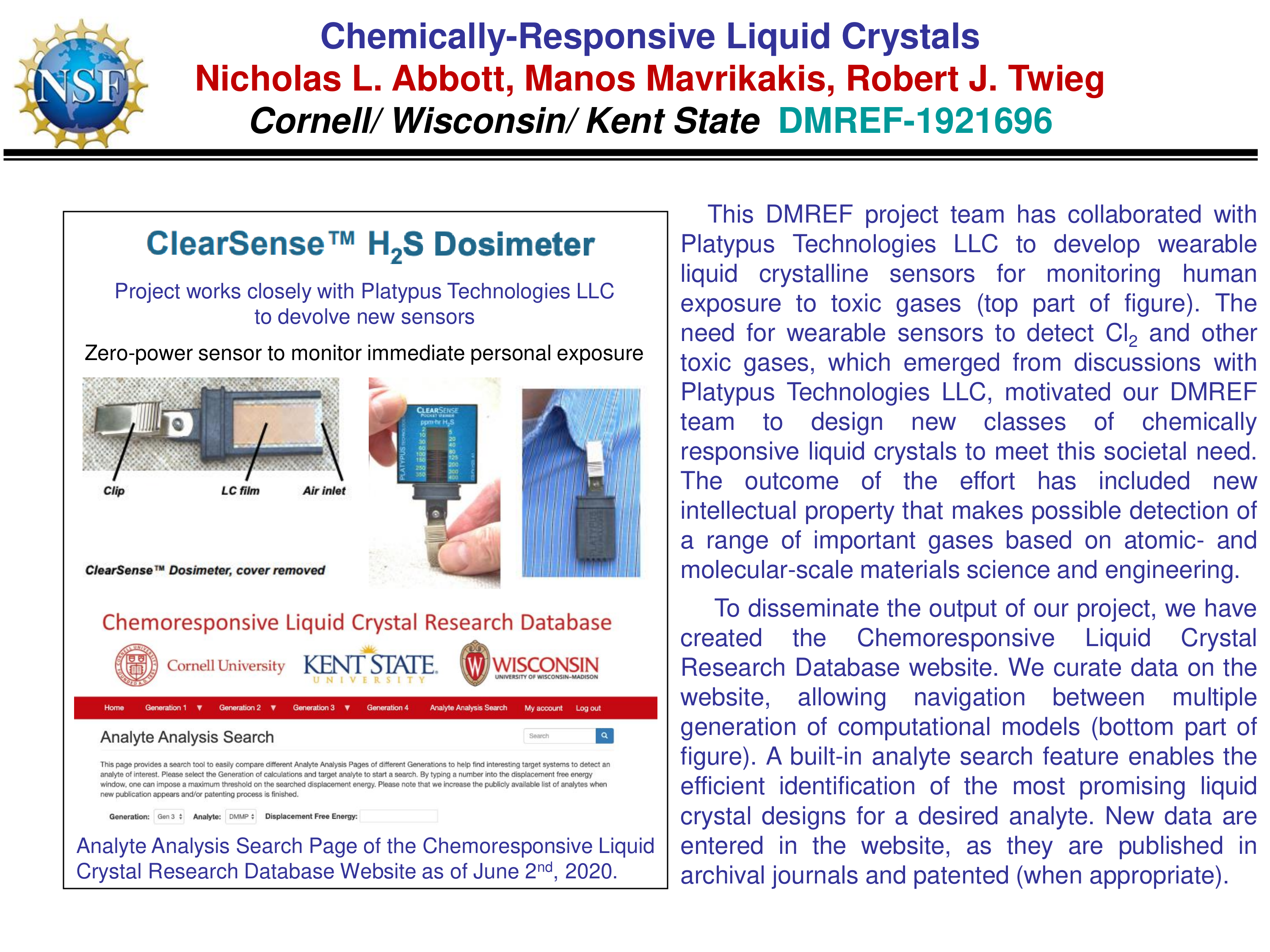 This DMREF project team has collaborated with Platypus Technologies LLC to develop wearable liquid crystalline sensors for monitoring human exposure to toxic gases (top part of figure). The need for wearable sensors to detect Cl2 and other toxic gases, which emerged from discussions with Platypus Technologies LLC, motivated our DMREF team to design new classes of chemically responsive liquid crystals to meet this societal need. The outcome of the effort has included new intellectual property that makes possible detection of a range of important gases based on atomic- and molecular-scale materials science and engineering.