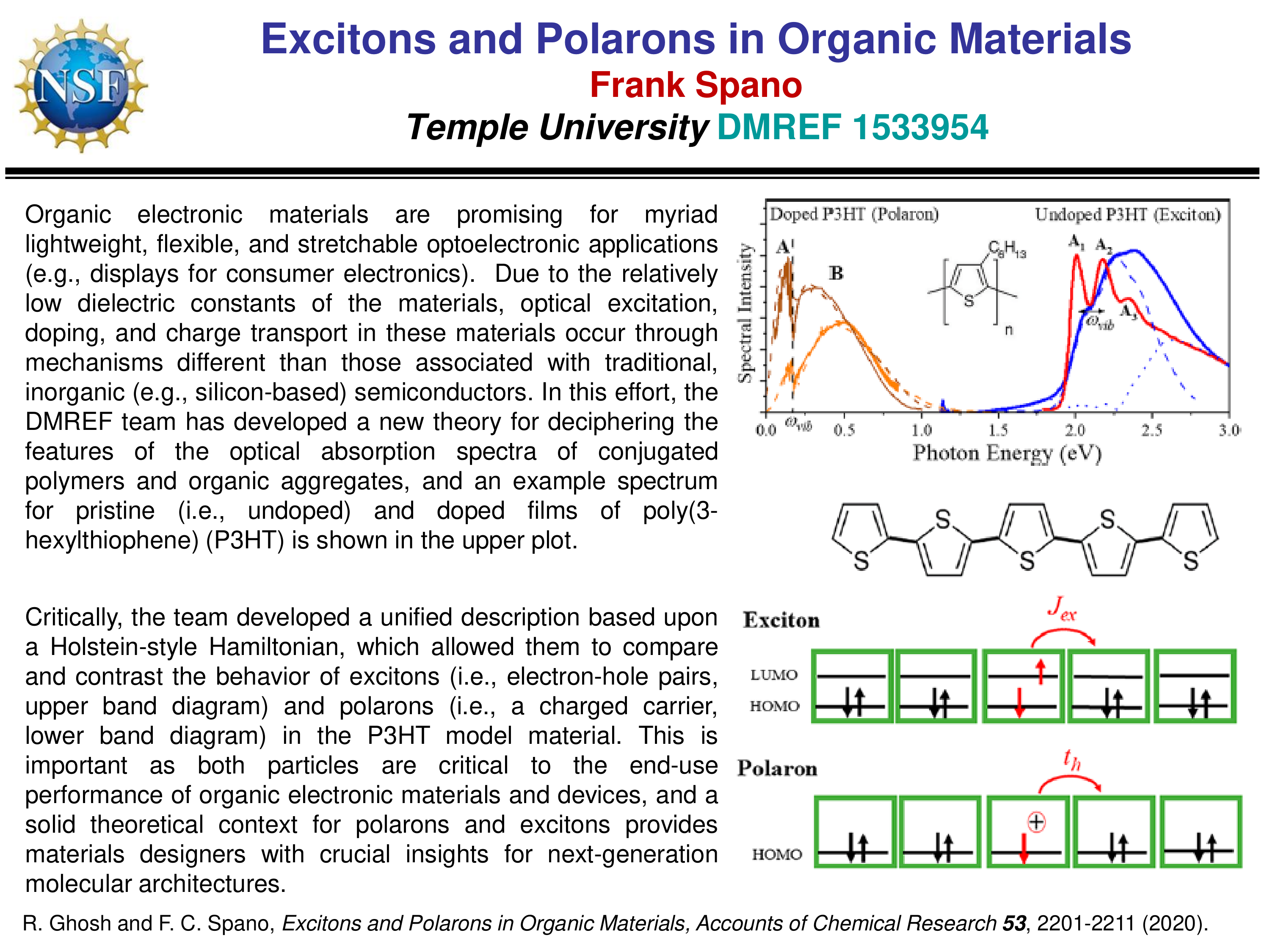 Organic electronic materials are promising for myriad lightweight, flexible, and stretchable optoelectronic applications (e.g., displays for consumer electronics).  Due to the relatively low dielectric constants of the materials, optical excitation, doping, and charge transport in these materials occur through mechanisms different than those associated with traditional, inorganic (e.g., silicon-based) semiconductors. In this effort, the DMREF team has developed a new theory for deciphering the features of the optical absorption spectra of conjugated polymers and organic aggregates.