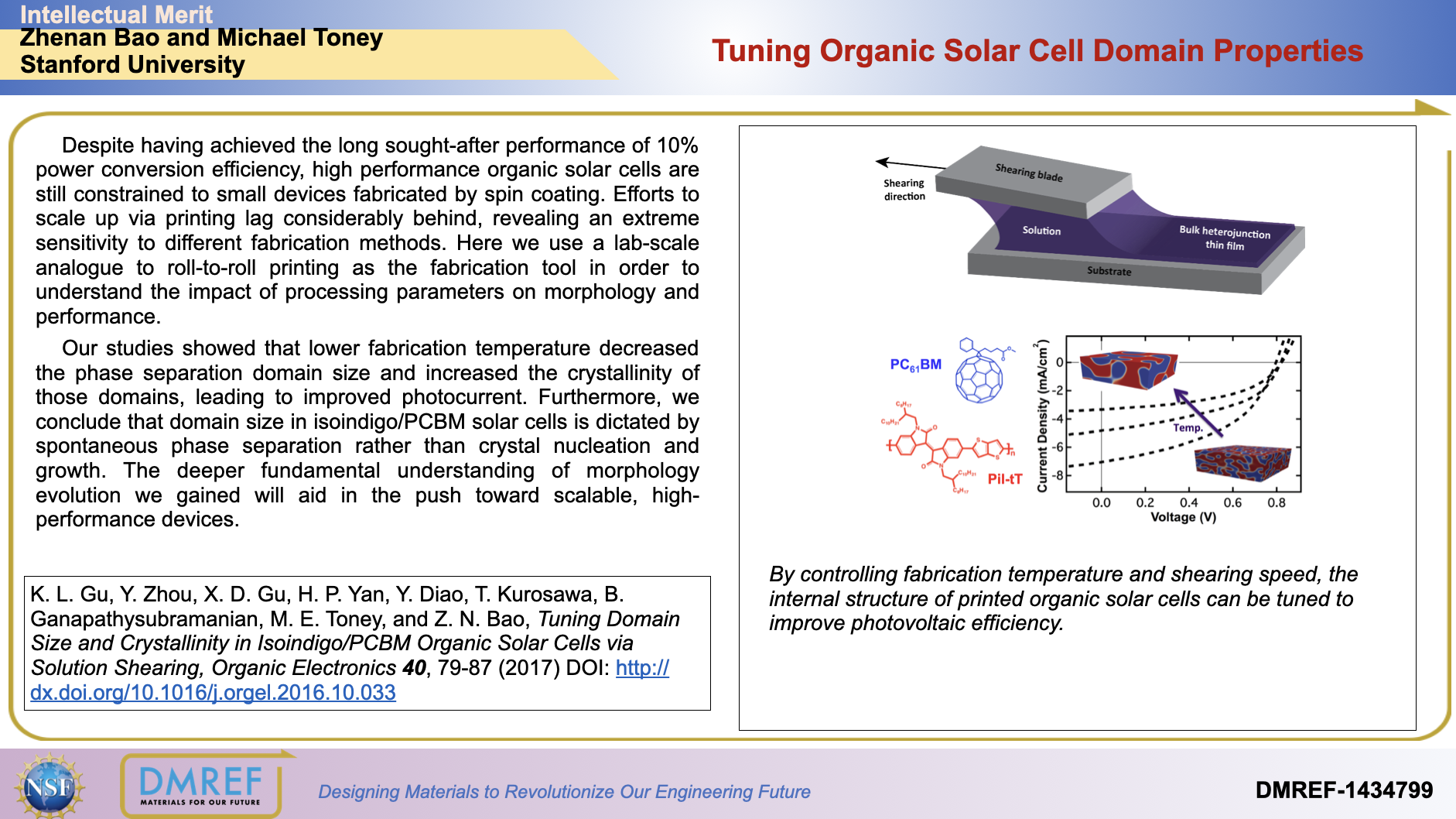 Our studies showed that lower fabrication temperature decreased the phase separation domain size and increased the crystallinity of those domains, leading to improved photocurrent. Furthermore, we conclude that domain size in isoindigo/PCBM solar cells is dictated by spontaneous phase separation rather than crystal nucleation and growth. The deeper fundamental understanding of morphology evolution we gained will aid in the push toward scalable, high-performance devices