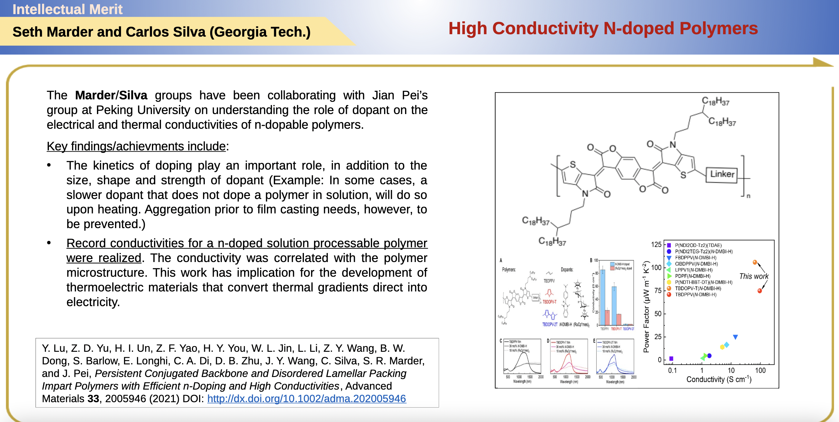 The Marder/Silva  groups  have  been  collaborating  with  Jian  Pei’s group at Peking University on understanding the role of dopant on the electrical and thermal conductivities of n-dopable polymers.