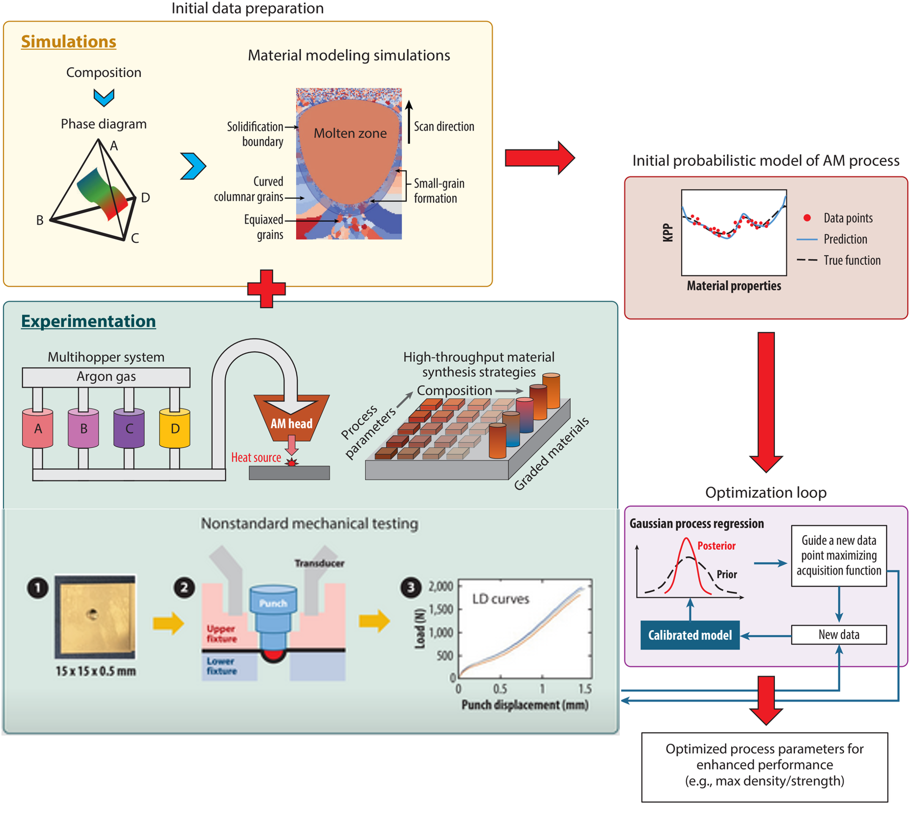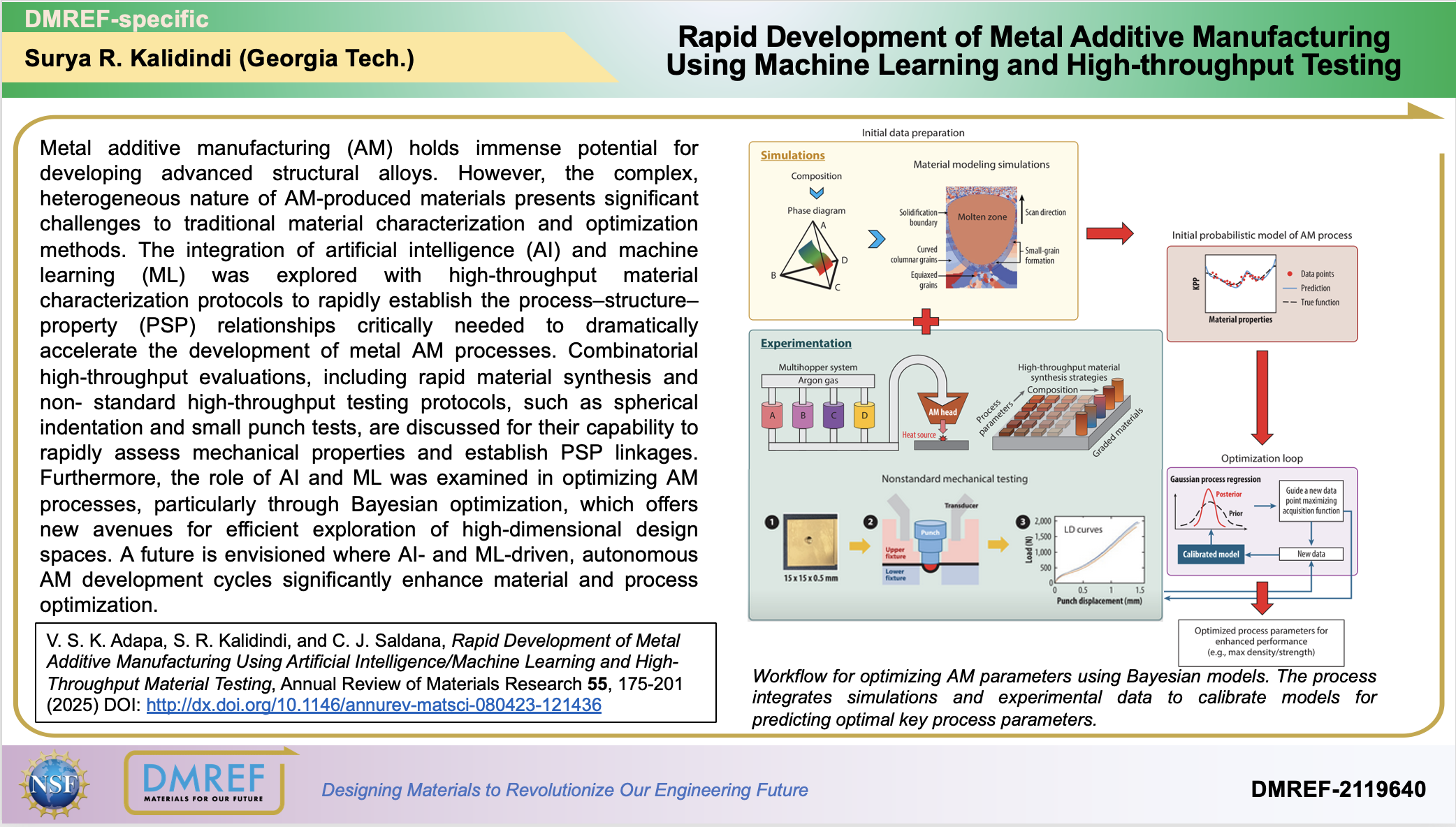 Metal additive manufacturing (AM) holds immense potential for developing advanced structural alloys. However, the complex, heterogeneous nature of AM-produced materials presents significant challenges to traditional material characterization and optimization methods. The integration of artificial intelligence (AI) and machine learning (ML) was explored with high-throughput material characterization protocols to rapidly establish the process–structure–property (PSP) relationships critically needed to dramatically accelerate the development of metal AM processes. Combinatorial high-throughput evaluations, including rapid material synthesis and non- standard high-throughput testing protocols, such as spherical indentation and small punch tests, are discussed for their capability to rapidly assess mechanical properties and establish PSP linkages. Furthermore, the role of AI and ML was examined in optimizing AM processes, particularly through Bayesian optimization, which offers new avenues for efficient exploration of high-dimensional design spaces. A future is envisioned where AI- and ML-driven, autonomous AM development cycles significantly enhance material and process optimization.