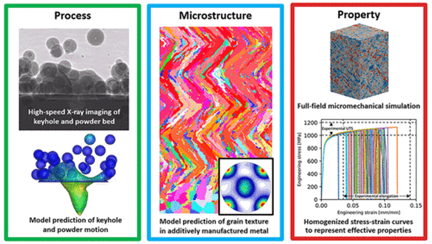 Additive Manufacturing (AM) technology produces three-dimensional components in a layer-by-layer fashion and offers numerous advantages over conventional manufacturing processes. Driven by the growing needs of diverse industrial sectors, this technology has seen significant advances on both scientific and engineering fronts. Fusion-based processes are the mainstream techniques for AM of metallic materials. As the metals go through melting and solidification during the printing processes, the final microstructure and hence the properties of the printed components are highly sensitive to the printing conditions and can be very different from those of the feedstock. It is critical to understand the process-microstructure-property relationship for the accelerated optimization of the processing conditions and certification of the printed components. While experimentation has been used widely to acquire a mechanistic understanding of this subject matter, numerical modeling has become increasingly helpful in achieving the same purpose. Here, the authors review their ongoing collaborative effort to establish a multiphysics modeling framework to predict the process-microstructure-property relationship in fusion-based metal AM processes. The framework includes three individual modules to simulate the dominating physics that dictate the process dynamics and microstructure evolution during printing as well as the responses of the printed microstructure to specific mechanical loadings.