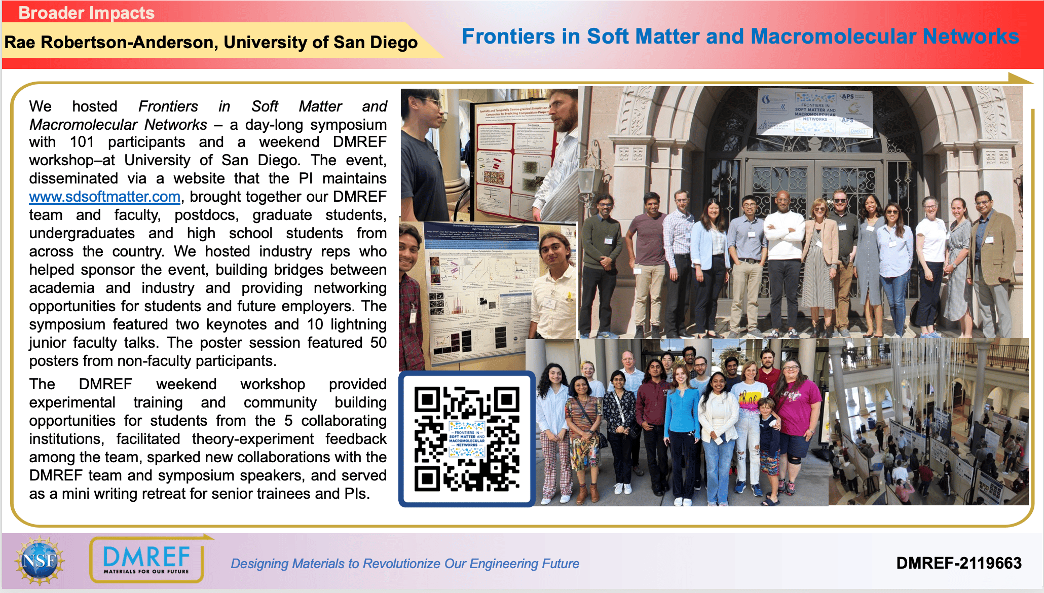 We hosted Frontiers in Soft Matter and Macromolecular Networks – a day-long symposium with 101 participants and a weekend DMREF workshop–at University of San Diego. The event, disseminated via a website that the PI maintains www.sdsoftmatter.com, brought together our DMREF team and faculty, postdocs, graduate students, undergraduates and high school students from across the country. We hosted industry reps who helped sponsor the event, building bridges between academia and industry and providing networking opportunities for students and future employers. The symposium featured two keynotes and 10 lightning junior faculty talks. The poster session featured 50 posters from non-faculty participants.