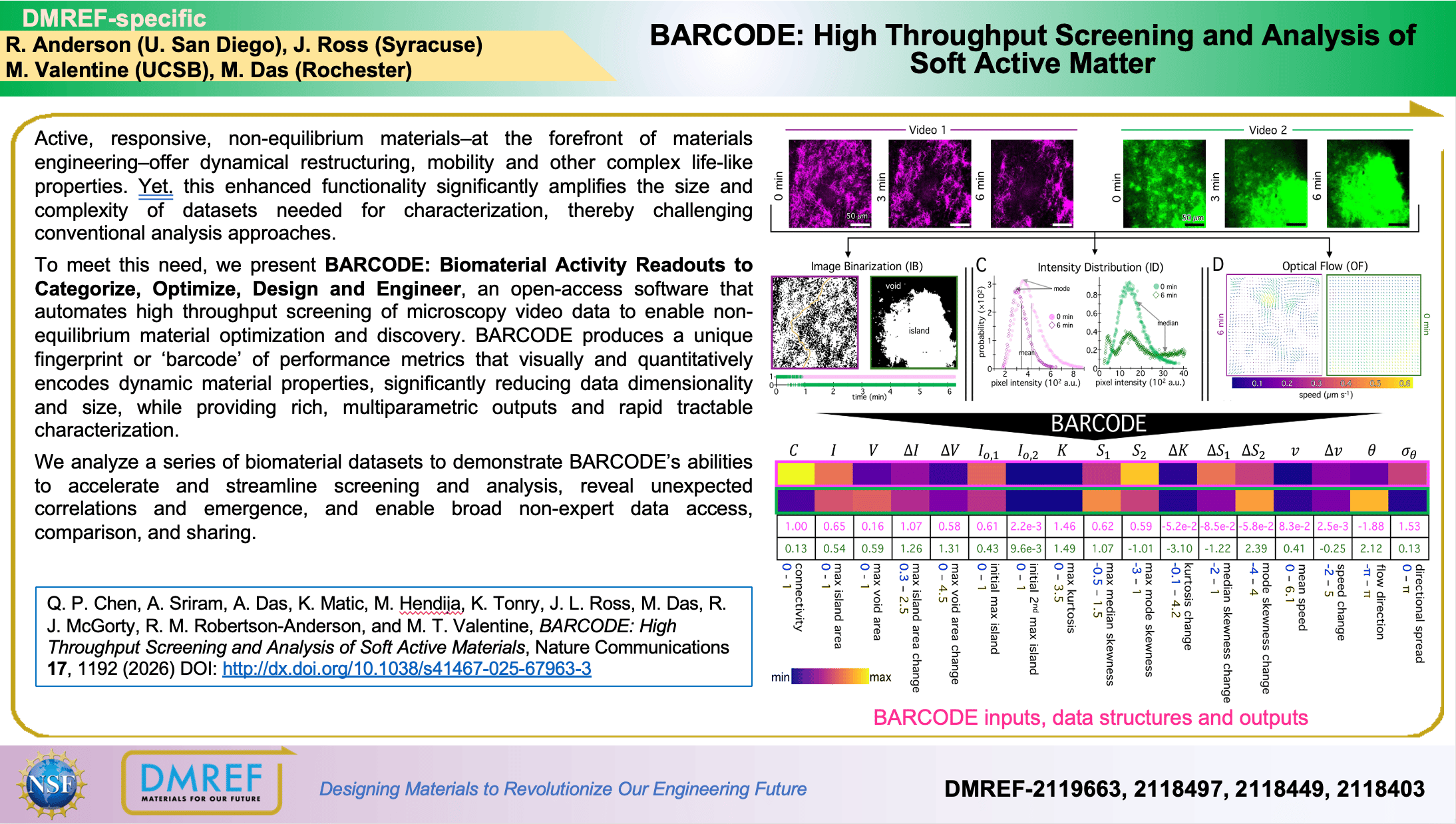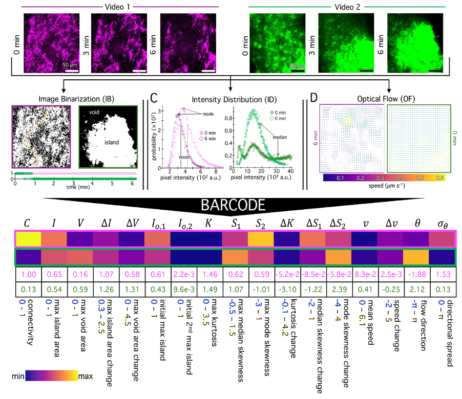 To meet this need, we present BARCODE: Biomaterial Activity Readouts to Categorize, Optimize, Design and Engineer, an open-access software that automates high throughput screening of microscopy video data to enable non-equilibrium material optimization and discovery. BARCODE produces a unique fingerprint or ‘barcode’ of performance metrics that visually and quantitatively encodes dynamic material properties, significantly reducing data dimensionality and size, while providing rich, multiparametric outputs and rapid tractable characterization.