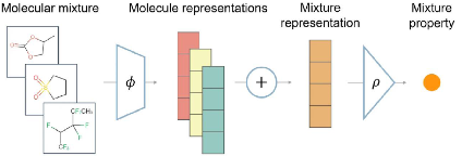 Recent advances in machine learning (ML) are expediting materials discovery and design. One significant challenge facing ML for materials is the expansive combinatorial space of potential materials formed by diverse constituents and their flexible configurations. This complexity is particularly evident in molecular mixtures, a frequently explored space for materials, such as battery electrolytes. Owing to the complex structures of molecules and the sequence-independent nature of mixtures, conventional ML methods have difficulties in modeling such systems. Here, MolSets, a specialized ML model for molecular mixtures, is presented to overcome the difficulties. Representing individual molecules as graphs and their mixture as a set, MolSets leverages a graph neural network and the deep sets architecture to extract information at the molecular level and aggregate it at the mixture level, thus addressing local complexity while retaining global flexibility. The efficacy of MolSets is demonstrated in predicting the conductivity of lithium battery electrolytes benefitting the virtual screening of the combinatorial chemical space.