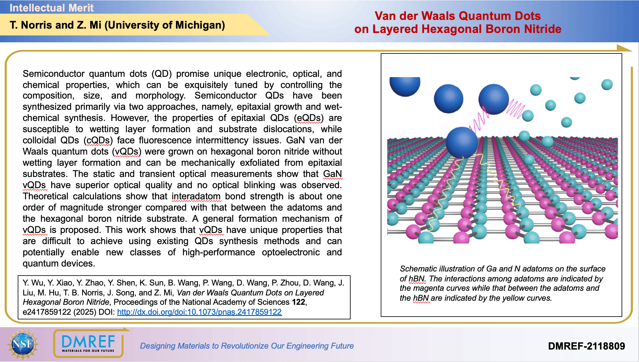 Semiconductor quantum dots (QD) promise unique electronic, optical, and chemical properties, which can be exquisitely tuned by controlling the composition, size, and morphology. Semiconductor QDs have been synthesized primarily via two approaches, namely, epitaxial growth and wet-chemical synthesis. However, the properties of epitaxial QDs (eQDs) are susceptible to wetting layer formation and substrate dislocations, while colloidal QDs (cQDs) face fluorescence intermittency issues. GaN van der Waals quantum dots (vQDs) were grown on hexagonal boron nitride without wetting layer formation and can be mechanically exfoliated from epitaxial substrates. The static and transient optical measurements show that GaN vQDs have superior optical quality and no optical blinking was observed. Theoretical calculations show that interadatom bond strength is about one order of magnitude stronger compared with that between the adatoms and the hexagonal boron nitride substrate. A general formation mechanism of vQDs is proposed. This work shows that vQDs have unique properties that are difficult to achieve using existing QDs synthesis methods and can potentially enable new classes of high-performance optoelectronic and quantum devices.