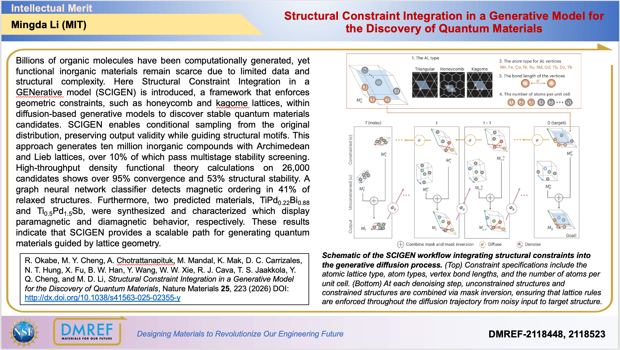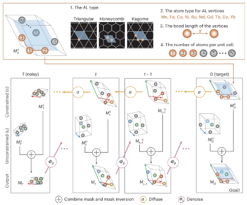 Billions of organic molecules have been computationally generated, yet functional inorganic materials remain scarce due to limited data and structural complexity. Here Structural Constraint Integration in a GENerative model (SCIGEN) is introduced, a framework that enforces geometric constraints, such as honeycomb and kagome lattices, within diffusion-based generative models to discover stable quantum materials candidates. SCIGEN enables conditional sampling from the original distribution, preserving output validity while guiding structural motifs. This approach generates ten million inorganic compounds with Archimedean and Lieb lattices, over 10% of which pass multistage stability screening. High-throughput density functional theory calculations on 26,000 candidates shows over 95% convergence and 53% structural stability. A graph neural network classifier detects magnetic ordering in 41% of relaxed structures. Furthermore, two predicted materials, TiPd0.22Bi0.88 and Ti0.5Pd1.5Sb, were synthesized and characterized which display paramagnetic and diamagnetic behavior, respectively. These results indicate that SCIGEN provides a scalable path for generating quantum materials guided by lattice geometry.