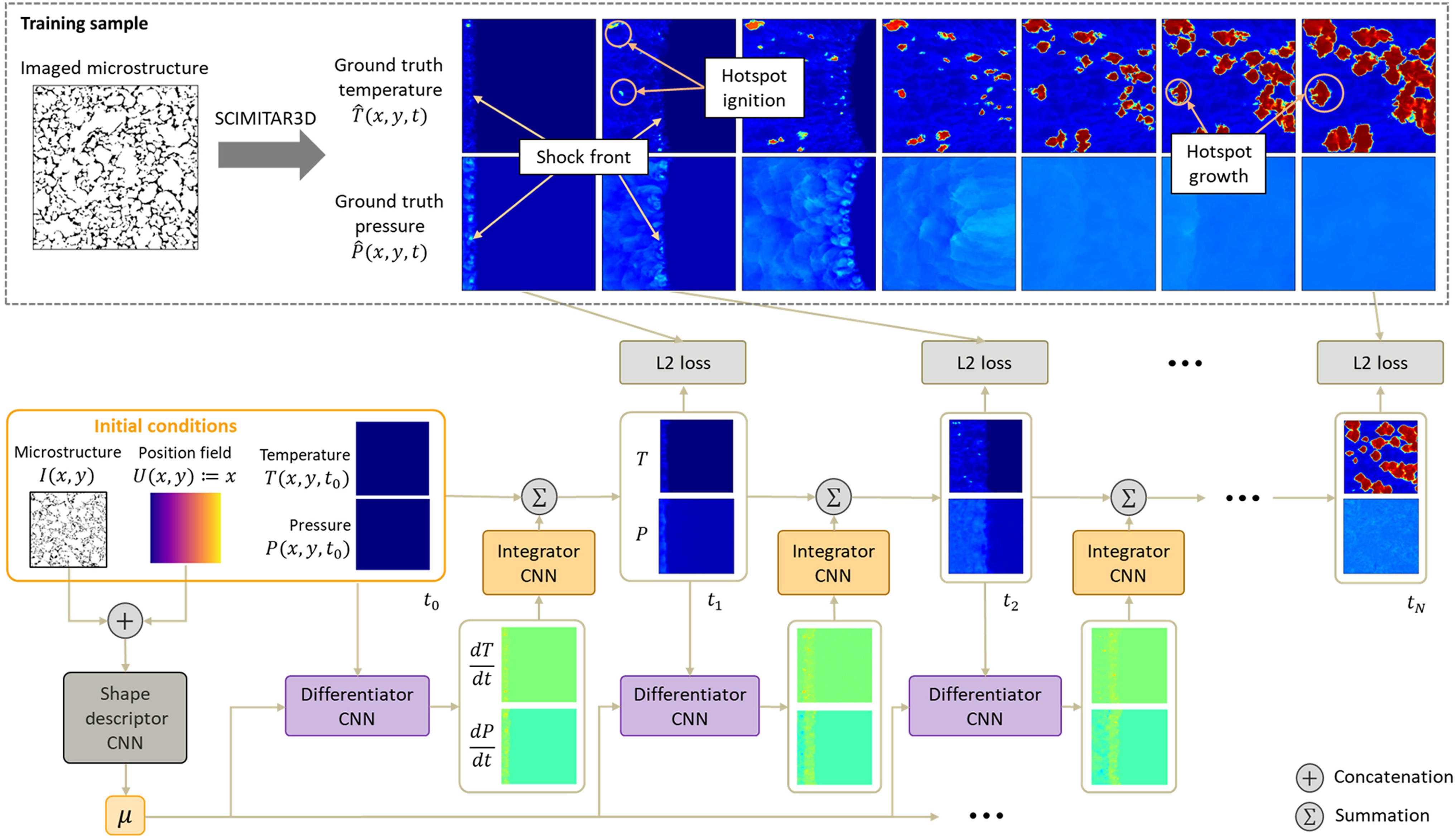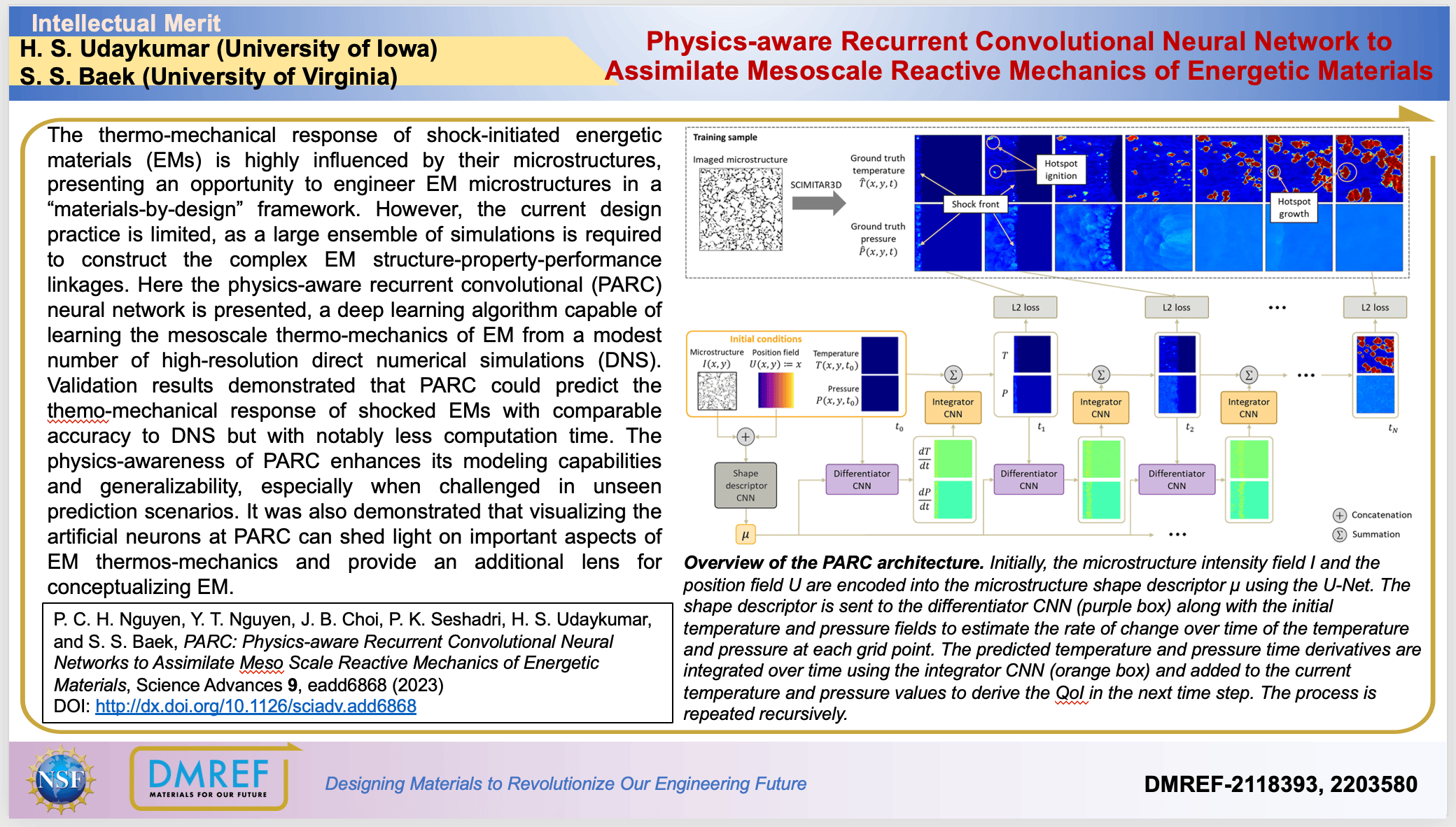 The thermo-mechanical response of shock-initiated energetic materials (EMs) is highly influenced by their microstructures, presenting an opportunity to engineer EM microstructures in a “materials-by-design” framework. However, the current design practice is limited, as a large ensemble of simulations is required to construct the complex EM structure-property-performance linkages. Here the physics-aware recurrent convolutional (PARC) neural network is presented, a deep learning algorithm capable of learning the mesoscale thermo-mechanics of EM from a modest number of high-resolution direct numerical simulations (DNS). Validation results demonstrated that PARC could predict the themo-mechanical response of shocked EMs with comparable accuracy to DNS but with notably less computation time. The physics-awareness of PARC enhances its modeling capabilities and generalizability, especially when challenged in unseen prediction scenarios. It was also demonstrated that visualizing the artificial neurons at PARC can shed light on important aspects of EM thermos-mechanics and provide an additional lens for conceptualizing EM.